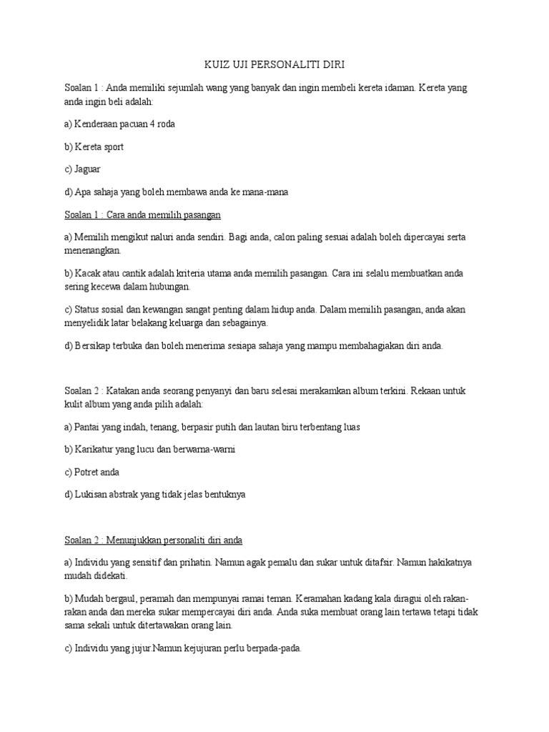 Kuiz Uji Personaliti Diri from imgv2-2-f.scribdassets.com Kuiz ini akan menberikan anda jawapan tentang apakah personaliti diri kamu!personaliti berasal daripada bahasa latin iaitu persona yang bermaksud topeng muka. Jom try personaliti diri ni, percuma je! Lihat lebih banyak kuiz personaliti. Tidak menghairankan bahawa responden dengan cepat menjadi bosan dan kecewa. Bagi seseorang wanita, kecantikan pada wajah mereka merupakan sesuatu yang penting ianya boleh memberikan keyakinan yang tinggi sekiranya mendapat pujian. Ujian simpel ini bukanlah memberi makna sepenuhnya tentang diri anda tetapi para ahli psikologi telah begitu lama menggunakan ujian ini untuk melihat diri sendiri. Lebih gemar menonjolkan diri dan menarik perhatian orang ramai. Sebagai salah satu kuiz personaliti yang paling popular dalam talian, dengan ujian dna visual who am i juga merupakan salah satu kuiz keperibadian yang paling menyeronokkan peperiksaan dua soalan ini banyak menjawab tentang siapa anda kemudiannya anda mungkin dapat menyedari.