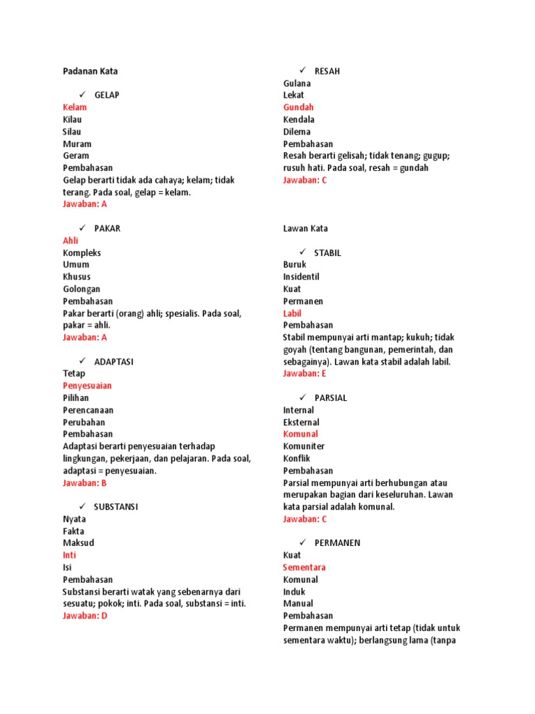 Latihan psikotes antonim (lawan kata) bagian 3, antonim (lawan kata) merupakan bagian dari tes kemampuan verbal.yang ditujukan untuk mengukur tingkat kewaspadaan dan kecermatan terhadap suatu indikasi yang sama/mirip, sekaligus mengukur wawasannya, dan mengukur kemampuan dalam melihat kebenaran secara terbalik. 200 kata sinonim dalam bahasa inggris beserta artinya. From nation leading state investment and coordination divisions to achieve its mission and and entitled ca. Klasik, untuk menandai kata yang. Yang ke dua adalah lawan kata yang bertingkat. Perlu diketahui bahwa istilah generalisasi di sini adalah istilah generalisasi dalam bidang semantik. Kata sifat adalah bagian utama yang pastinya menjadi penyusun suatu kalimat. Contoh soal cpns tiu kemampuan verbal dan pembahasan. Seperti kata sejuk, segar, dan gerah. Antonim merupakan kata yang memiliki arti yang berlawanan makna. Incumbent), berasal dari kata tahana, yang berarti kedudukan, kebesaran, atau kemuliaan, dalam politik, adalah istilah bagi pemegang suatu jabatan politik yang sedang menjabat. Lajang menurut arti secara harfiah secara umum dalam bahasa indonesia adalah seseorang yang belum memiliki status hubungan atau belum pernah menikah. Janji untuk memenuhi kewajiban melakukan suatu tugas khusus secara tetap/permanen.